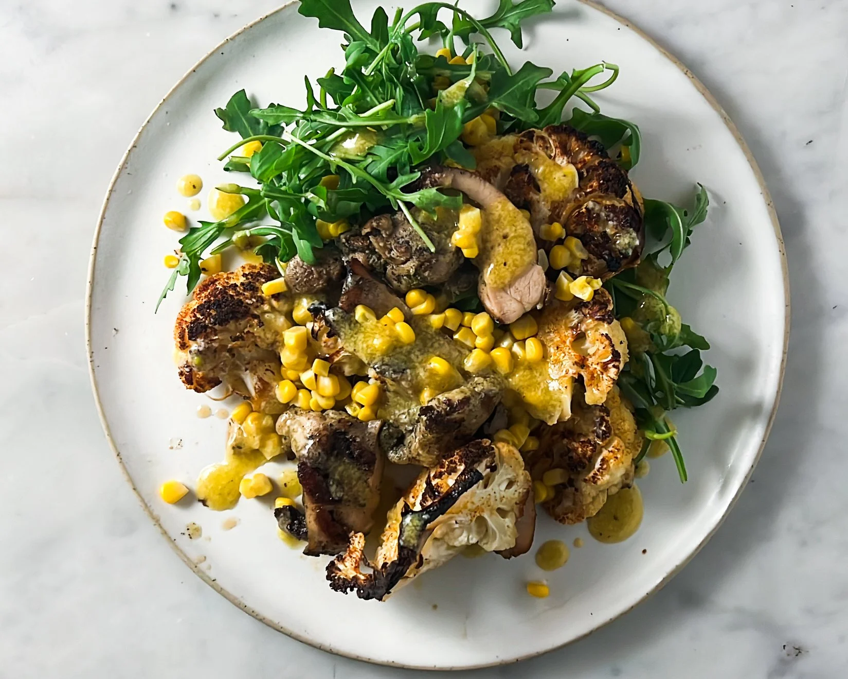 - Add the wedges of cauli and the chicken and the steamed corn then drizzle the tangy dressing over the salad.