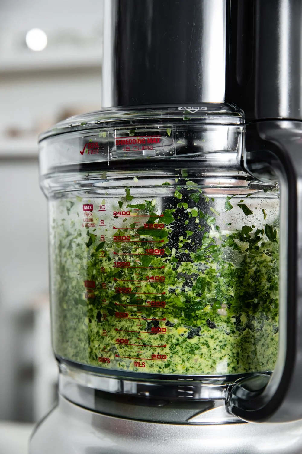 Place all the herbs, onion, lemon skin and garlic into the FOOD PROCESSOR bowl and pulse until finely minced.